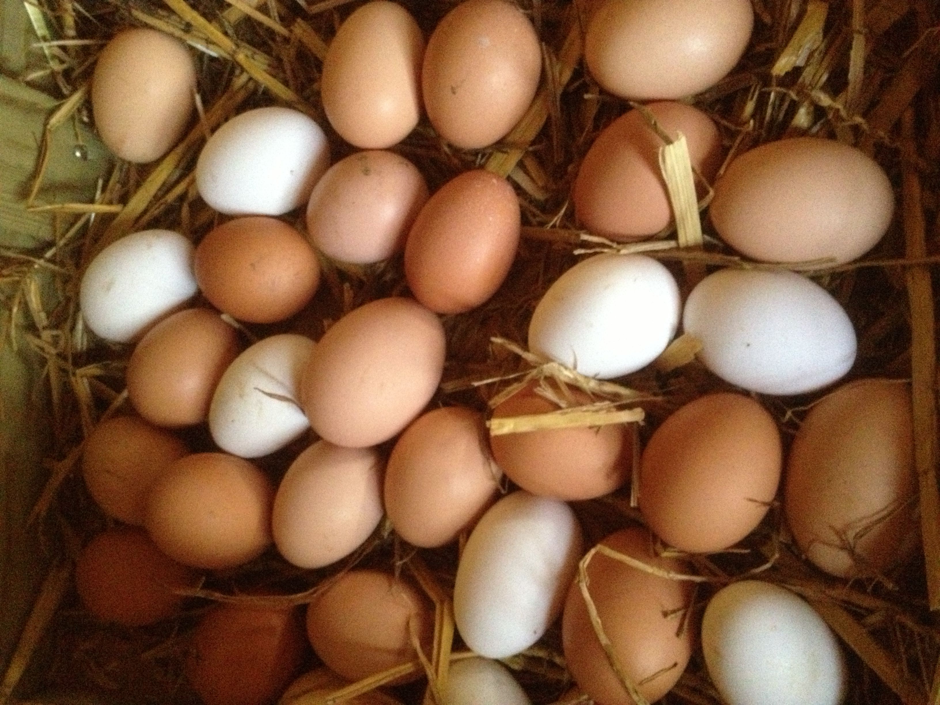 Our own eggs from our mixed heritage breed birds, who roam in our old orchards. Different breeds of chickens give us different coloured eggs, rich pastures that are full of insects and flowers give the yolks their coulour.